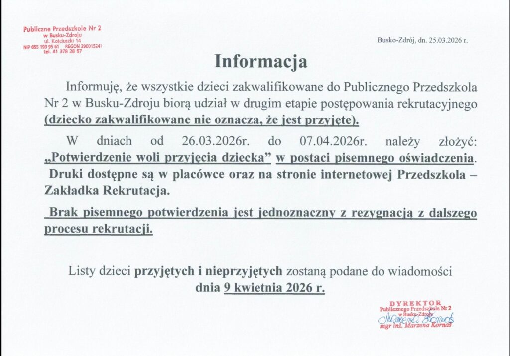 Informacje dotyczące rekrutacji do Publicznego Przedszkola Nr 2 w Busku-Zdroju na rok szkolny 2026/2027